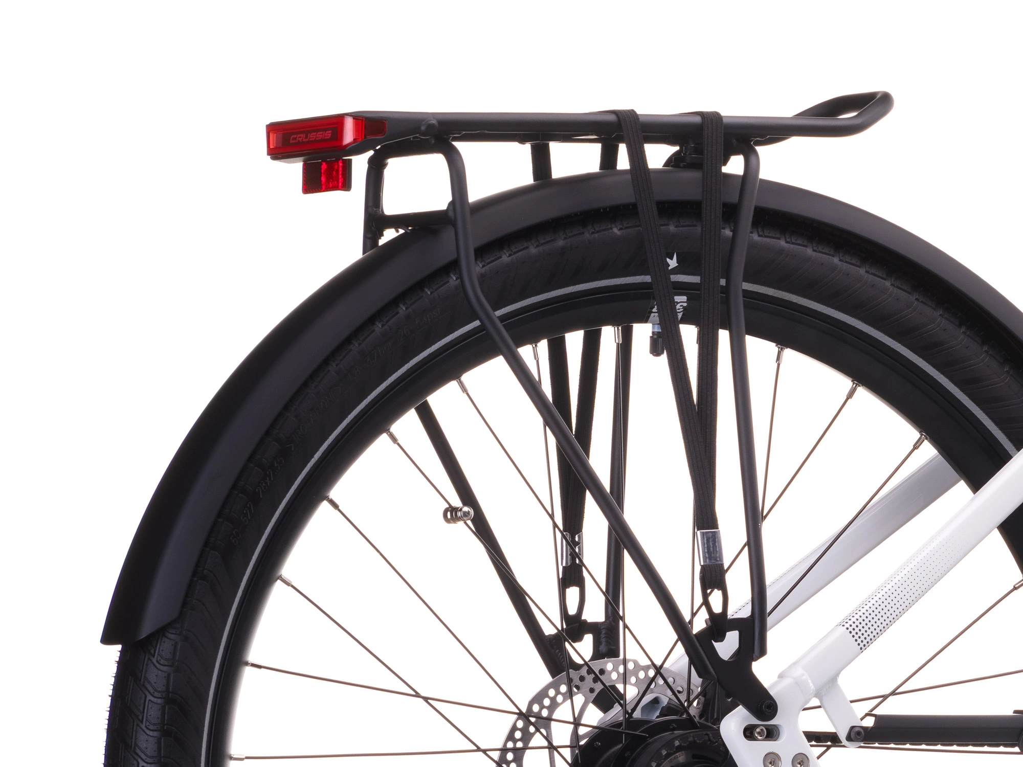 Käytännöliset varusteet, kuten lokasuojia, tavarateline, seisontajalka ja valot, tekevät e-Country BELT 7.11:stä ihanteellisen sähköpyörän monipuoliseen ja ympärivuotiseen käyttöön.