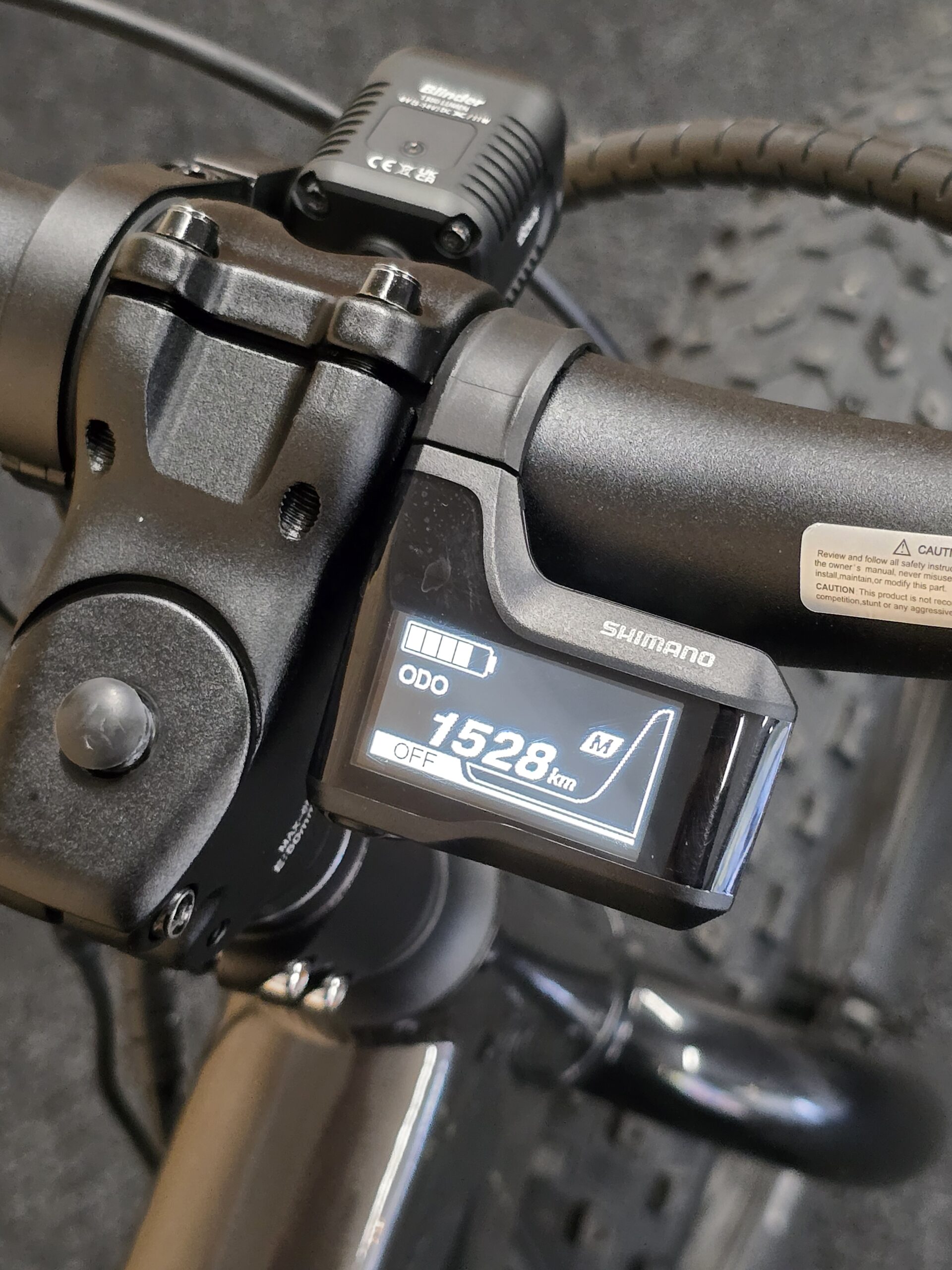 Pyörään asennettu Knog Blinder 1300lm valo, joka ottaa virran suoraan akulta.