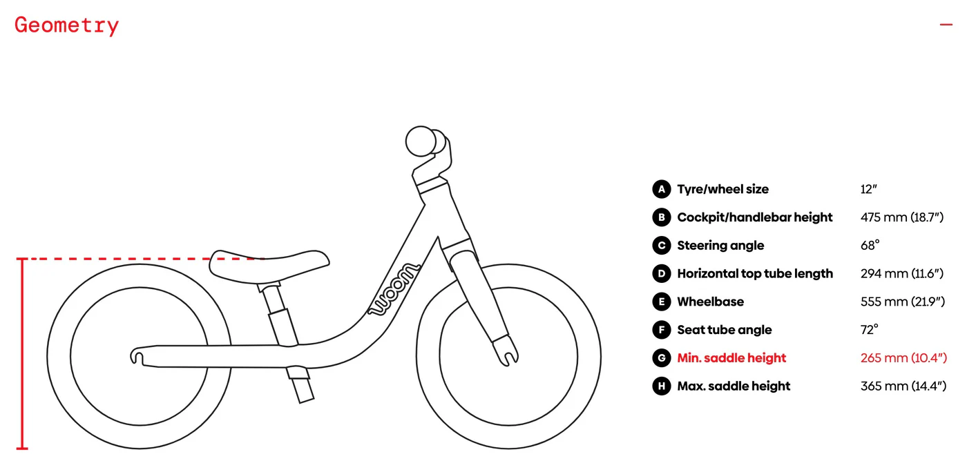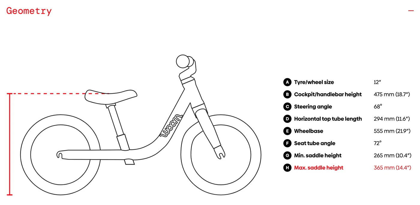 Woom Go 1:n geometria on kehitetty erityisesti kaikkein nuorimmille lapsille. Matala runko ja erittäin alhainen kynnys tekevät pyörälle nousemisesta ja siltä poistumisesta helppoa jo kävelyikäisille. Ovaloitu satulaputki ja huolellisesti mitoitettu runko tukevat luonnollista ajoasentoa.